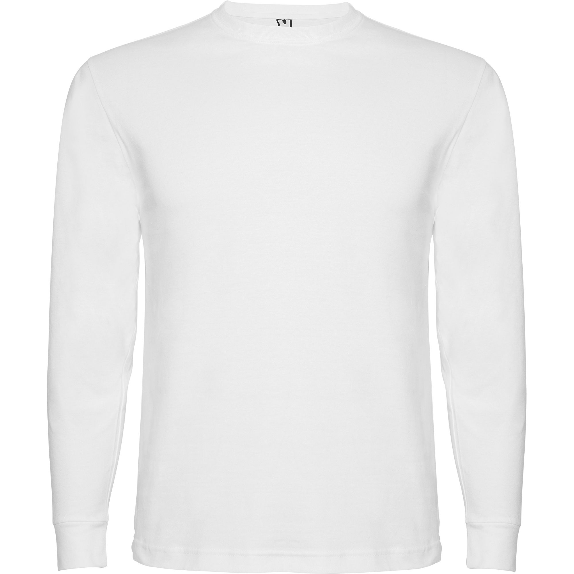 Camiseta de manga larga tubular en tallas de adulto y costuras laterales en tallas de niño. Cuello redondo y puños en canalé 1×1 (cuello 4 capas). Cubrecosturas en cuello del mismo tejido.